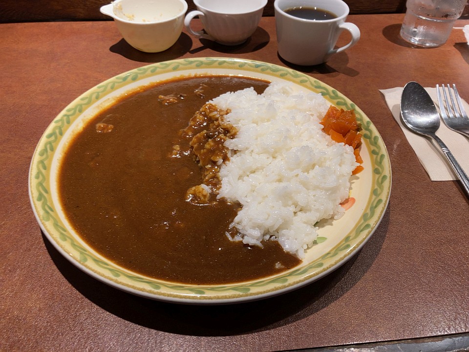 さてメニューを見るとカレー、チキンカレーと目につきました。ちょっと迷って普通のカレーに決定。しかし隣に座ったお客が頼んだのはハンバーグカレー。「あれ?メニューにあったかな?」と思ったものの人見知りなカレー好きライターは聞いてみませんでした(笑)