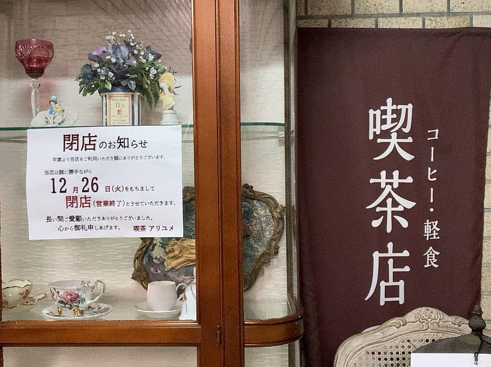 閉店のお知らせそんなアリユメは令和5年、2023年12月26日で閉店するとか。KBC「アサデス」の情報によると、昭和49年(1974年)にオープンしたようです。50年近い歴史の純喫茶。昭和を感じるお店が減っていくのは寂しい限りです。