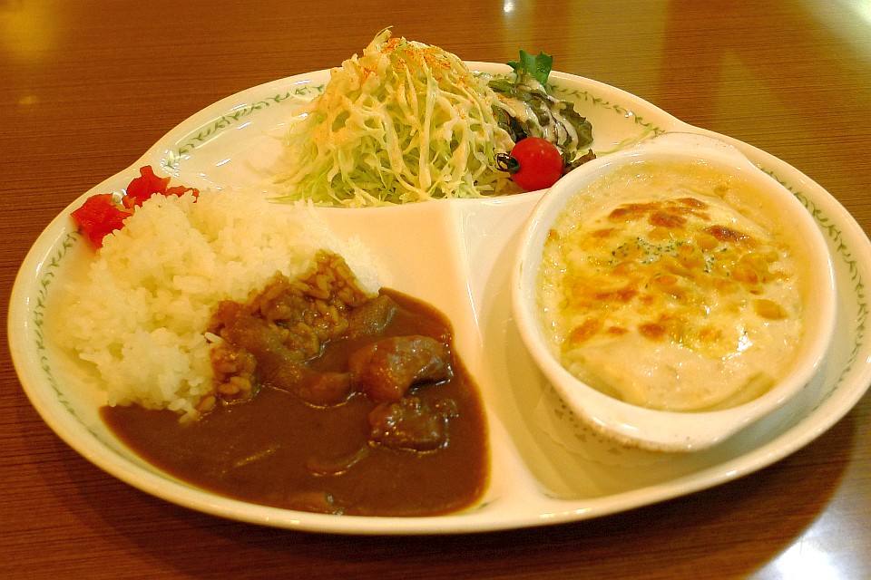 それはさておき。肝心のカレーについて。カレーだけでは物足りない、と思ったようで、プレートメニューを注文。記事タイトルにあるように、カレー&グラタンを頼んでみました。