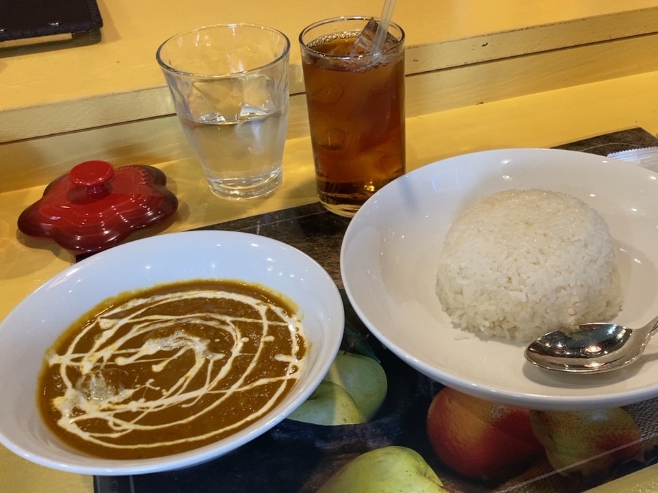 辛さを5段階から選べて、甘い方から4番目(辛口)にしました。カレーハウスでは、ナンを食べることが多いので、今日はライスを選択。ドリンクは、オレンジジュース、ウーロン茶、コーラの3つから選べます。さっぱりすると思って、ウーロン茶をオーダー。
