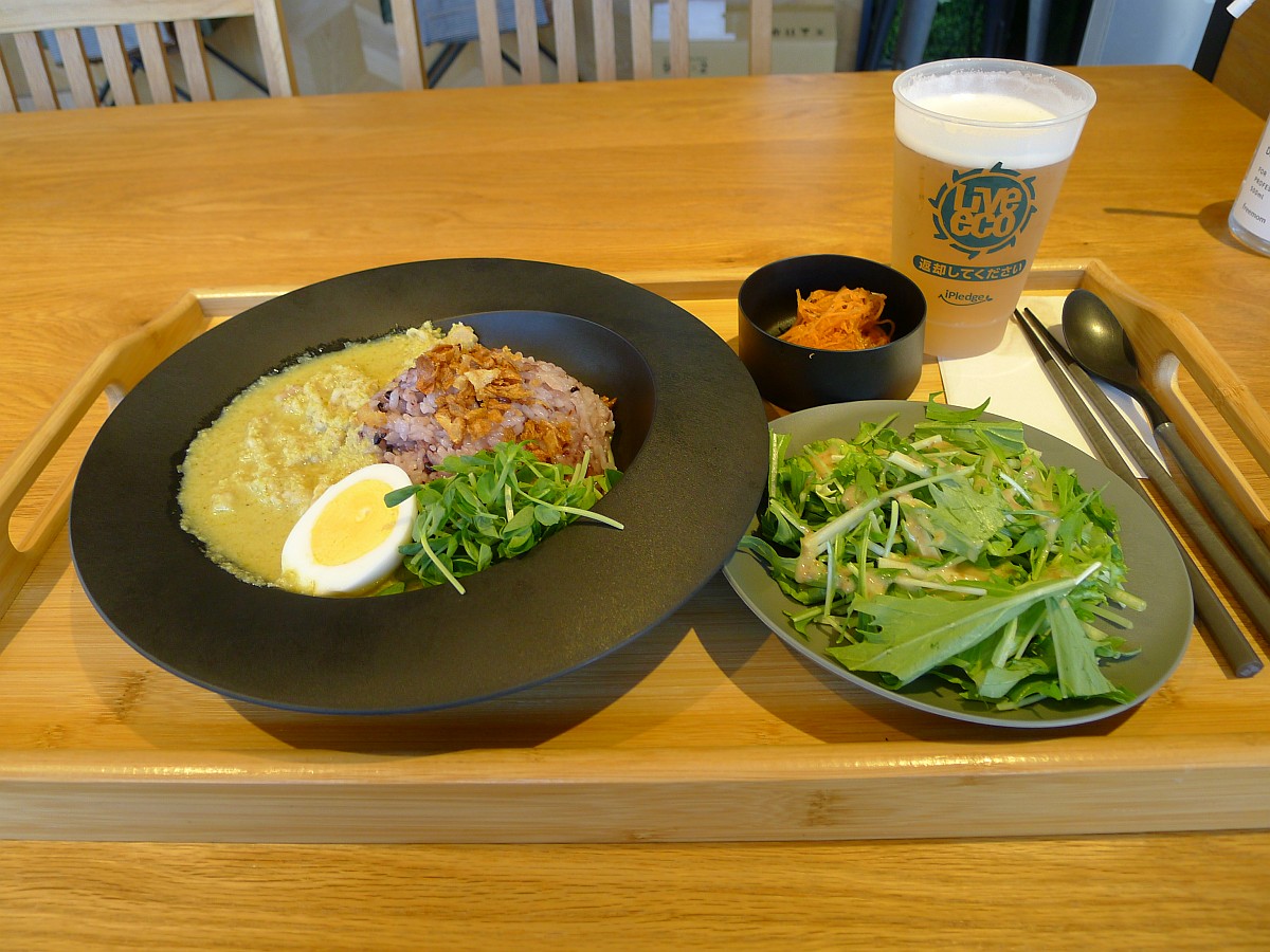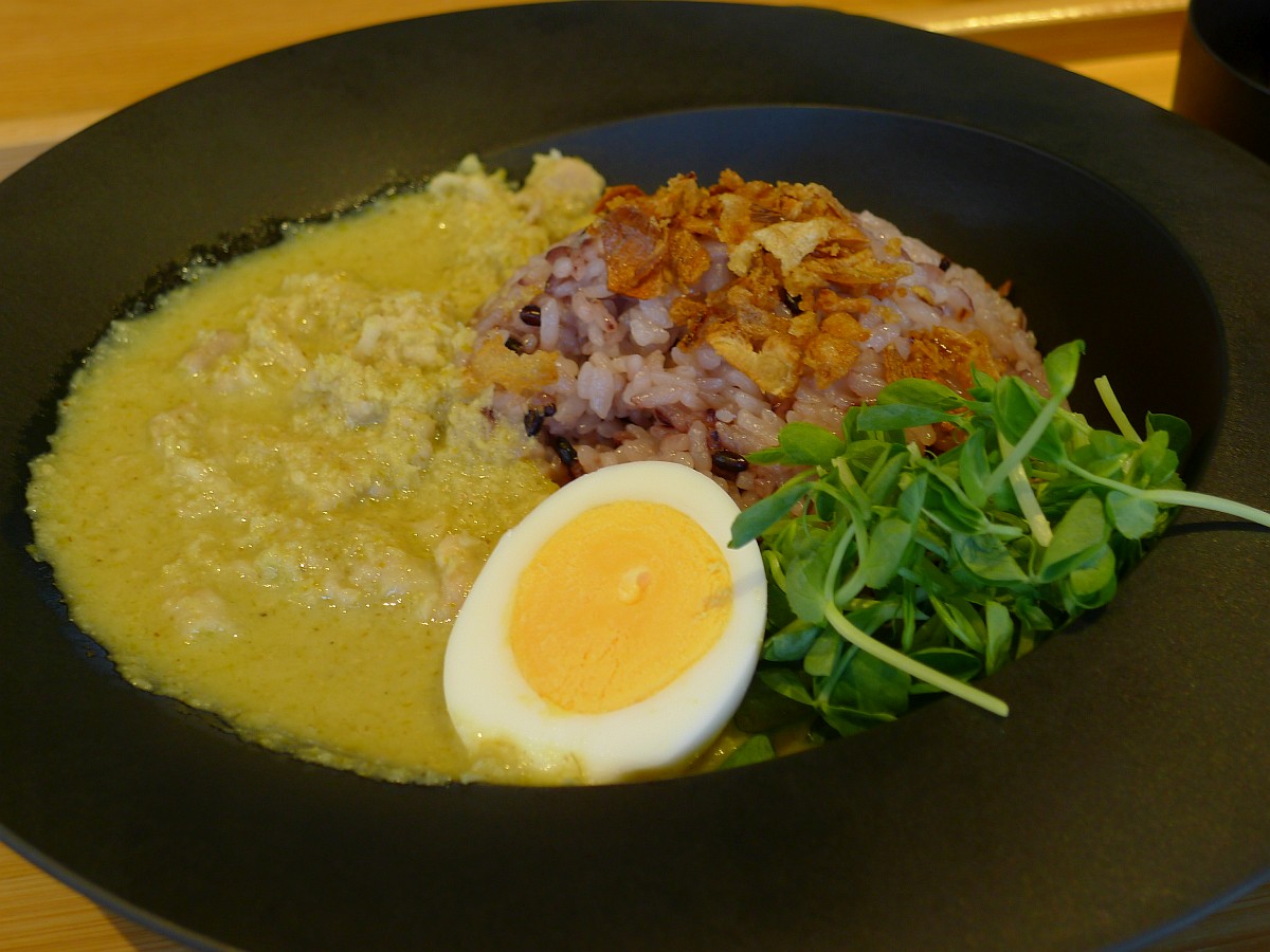 木製トレーに乗って提供されたグリーンカレー。雑穀米との組み合わせが新鮮に感じました。私は大抵サラダなどを先に食べることが多いのですが、今日は先にカレーを一口。すると、一気に辛さの味覚が舌全体に広がった感じ(あくまで私の感覚です(^_^;) )