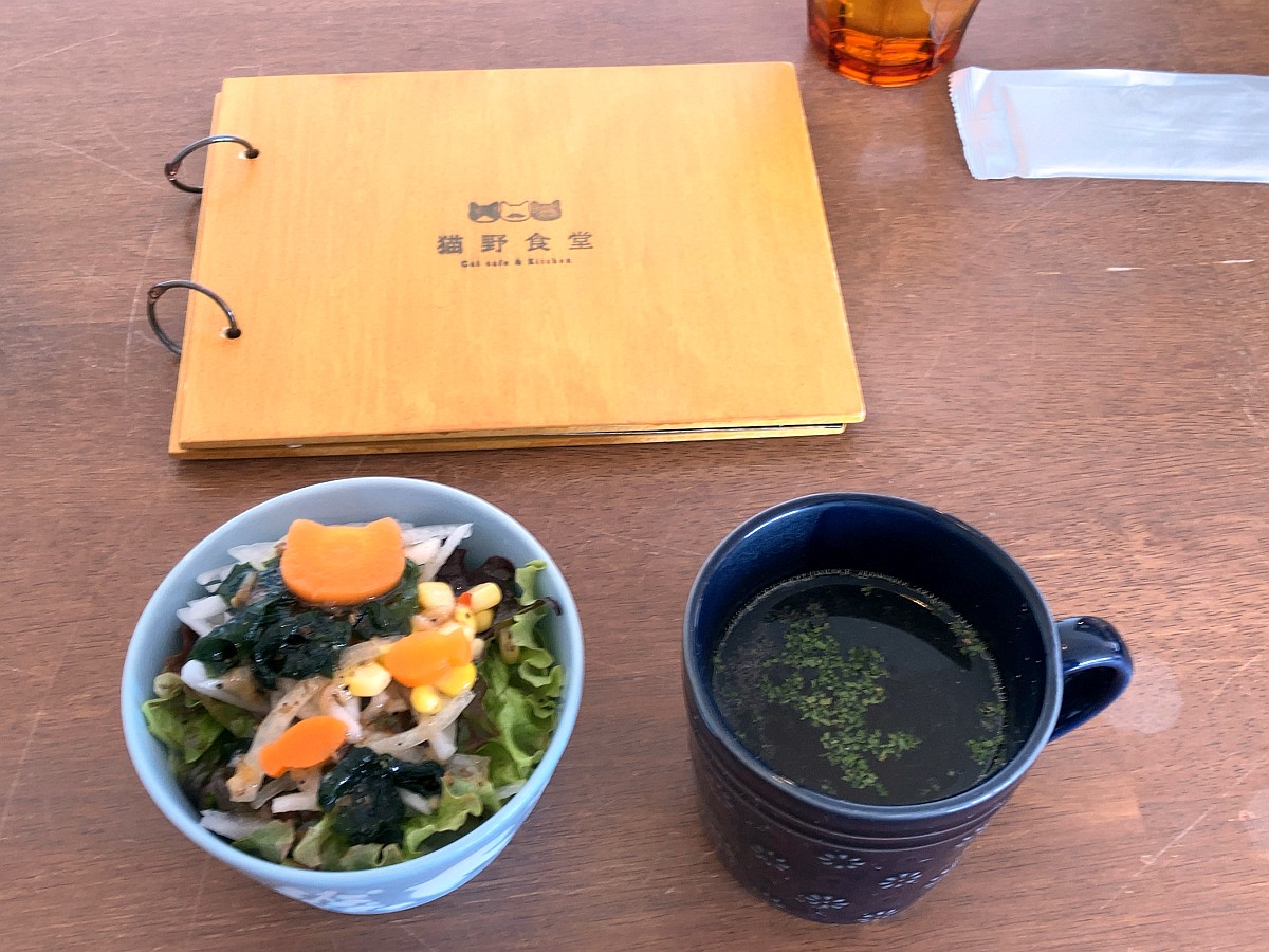 注文して最初に提供されたのがコンソメスープとサラダ。コショウがピリッと効いて刻み玉ねぎが入ったスープは、ちょっとスパイシー。猫型、魚型の人参が載った、みずみずしいサラダとマッチした感じでした。