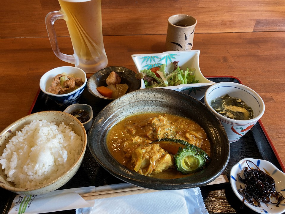 蕎麦や和食が評判のお店らしく、運ばれてきたカレーには小鉢など盛りだくさん。一瞬、どうやって食べるのかな?と思ってしまった(聞けばよかったかも)。茶碗に盛られたご飯を箸でカレールーの皿に運んでから食べました。